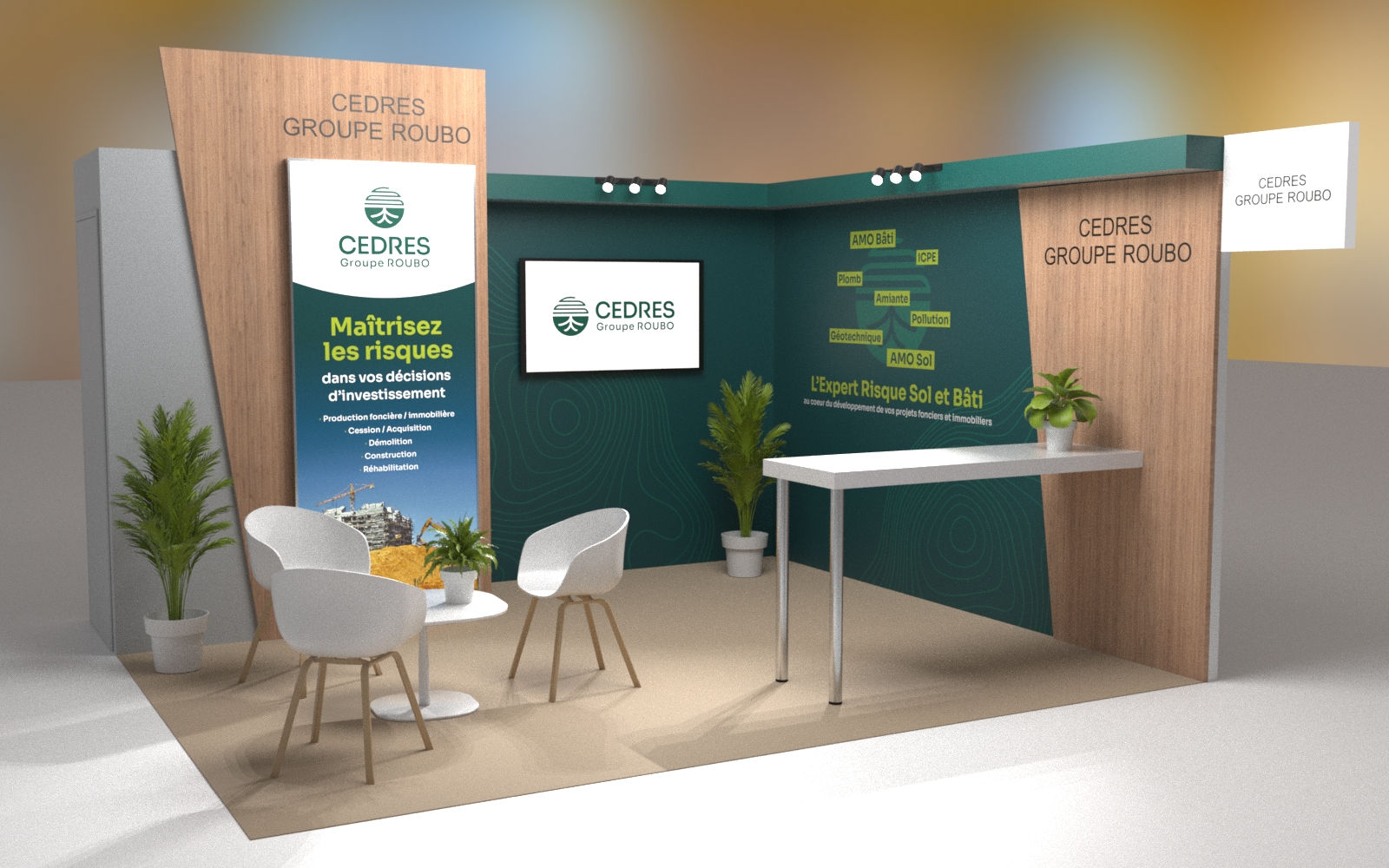 Cubedesigners designs tailor-made stands for trade shows. Wall mounts, Kakemonos, posters, video animations, we design all the elements that make up attractive and coherent spaces. We support our clients from design to completion, respecting the specifications of the events and the allocated budget envelopes. Our mastery of 3D tools allows us to create realistic previews, allowing our clients to project themselves easily and validate the visual consistency of the designs.